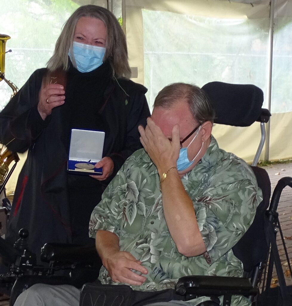 Robert Tremblay, ému lorsque la députée Christine St-Pierre lui annonce qu’il reçoit la médaille de l’Assemblée nationale (Photo : jdv – Philippe Rachiele)