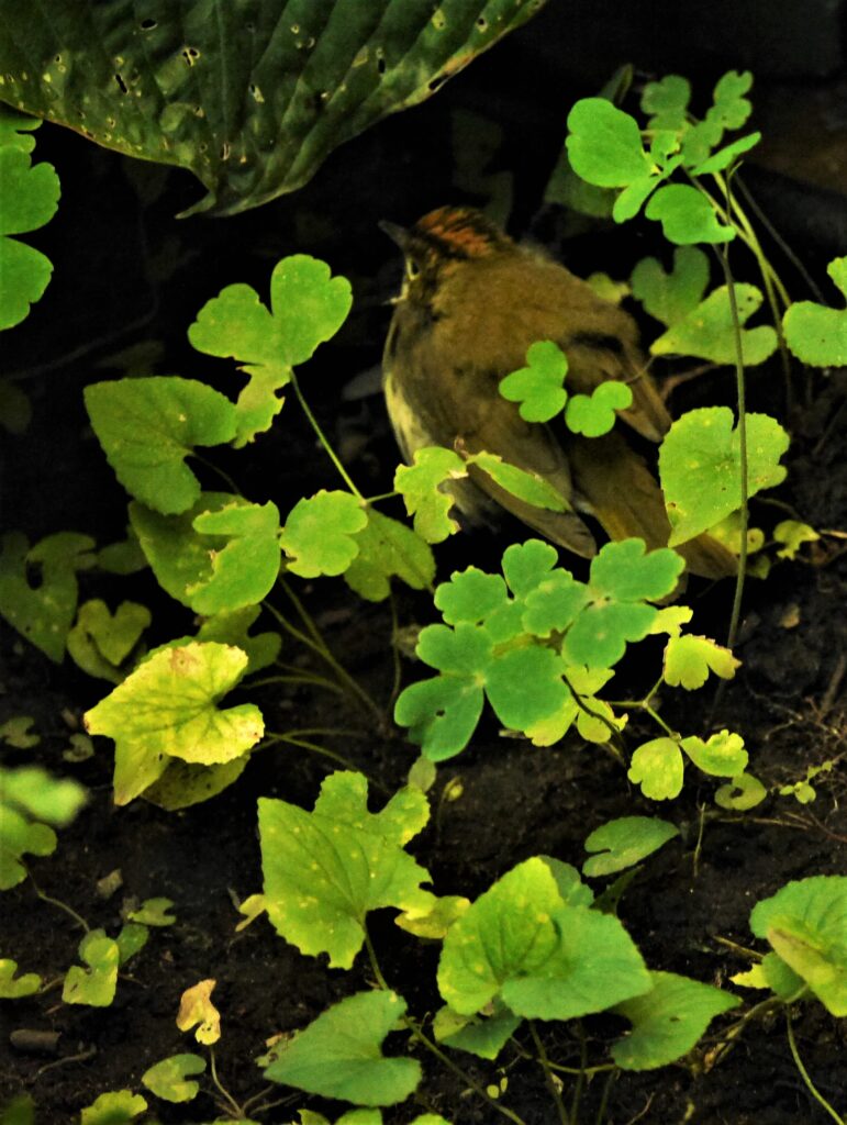 On entend plus souvent la Paruline couronnée qu’on ne la voit. Son « Ticha-ticha-ticha » en crescendo retentit dans les boisés et forêts d’une bonne partie du territoire québécois méridional. Mais ses habitudes et comportements la rendent plus difficile à voir.