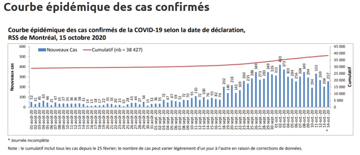 L’état de situation hebdomadaire de la DRSP donne également des signes de ralentissement de la contamination : avec 117 nouveaux cas déclarés entre le 6 et le 12 octobre, il s’agit de la première fois depuis le début septembre que le nombre de nouveaux cas hebdomadaires est en baisse par rapport à la semaine précédente.