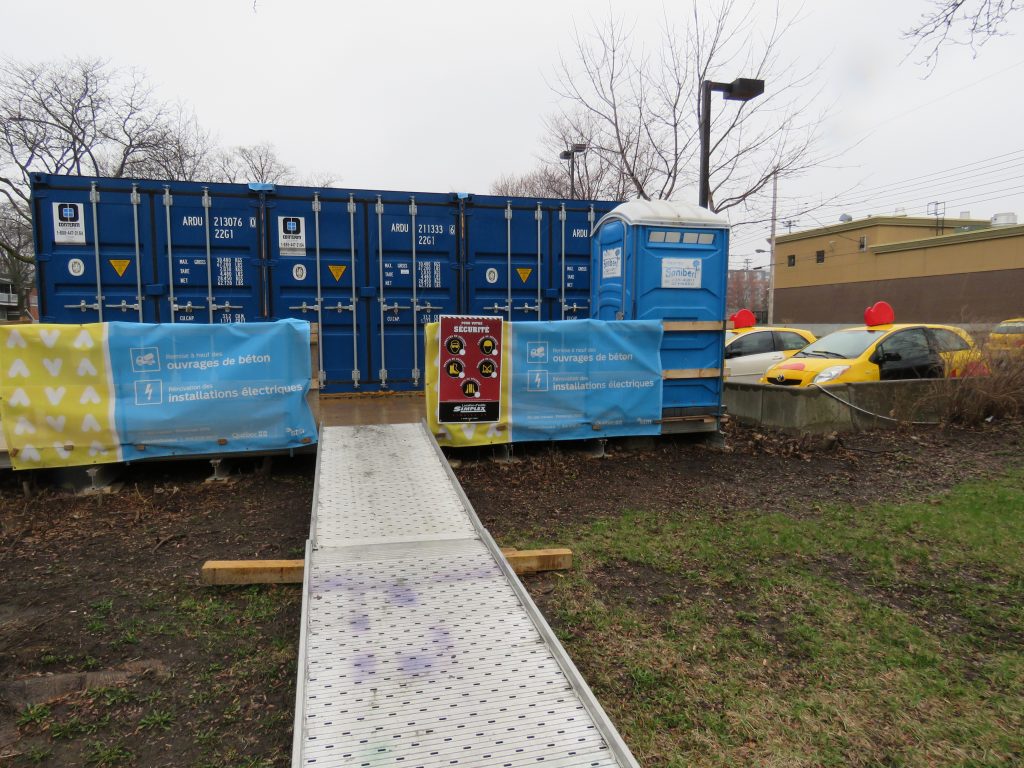 Depuis le mois de janvier, trois conteneurs bleus dissimulent des travaux au coin des rues Berri et Prieur Est sur le terrain adjacent à la rôtisserie St-Hubert. Toutefois, aucune information n’était disponible sur le site Web de la STM afin d’expliquer la nature des travaux qui s’y déroulaient.