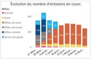 Tout comme le nombre de cas de COVID-19, le nombre d’éclosions est constamment en baisse à Montréal. Par contre, comme pour le nombre de cas, l’évolution de cette statistique est en lien direct avec le fait que depuis le 7 janvier 2022, les activités de dépistage, d’enquête des cas et de saisie des données concernant les milieux de soins, de vie ou plus vulnérables (ex. : hébergement en itinérance) sont priorisées.