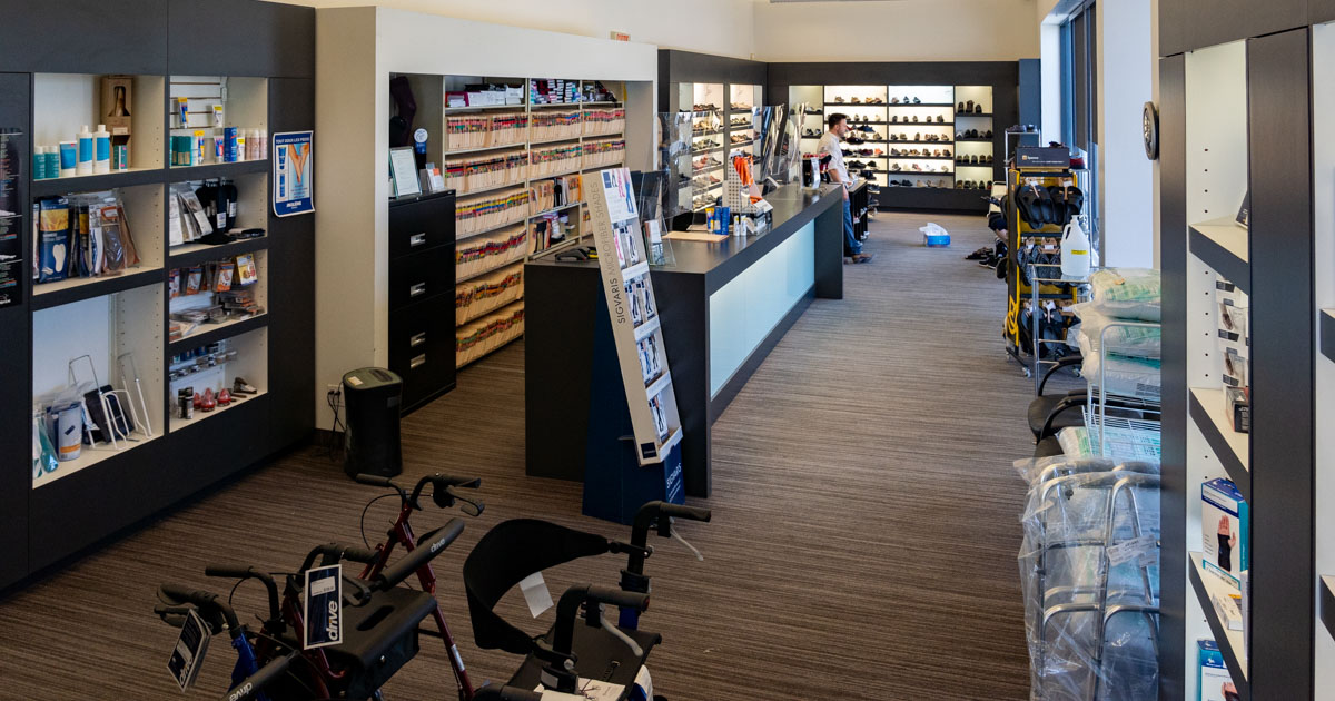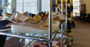 On le voit dans le choix de matériaux extensibles des chaussures ou dans le large éventail de tailles qui dépassent souvent ce qu’on trouve dans le commerce. Il y a aussi un rayon rempli d’objets conçus pour aider le corps dans ces mouvements quotidiens: immobiliser un genou, répartir des tensions sous le pied, créer de nouveaux appuis.