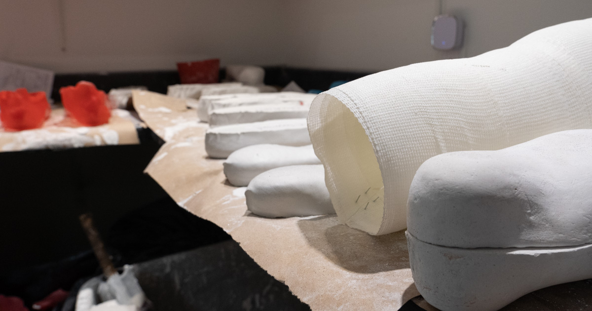 Un client égaré pourrait être troublé d’y observer autant de moulures de pieds, mais c’est un décor habituel pour un orthésiste. Après l’examen, l’empreinte est reconstituée en plâtre et sert de base à la fabrication de l’orthèse.