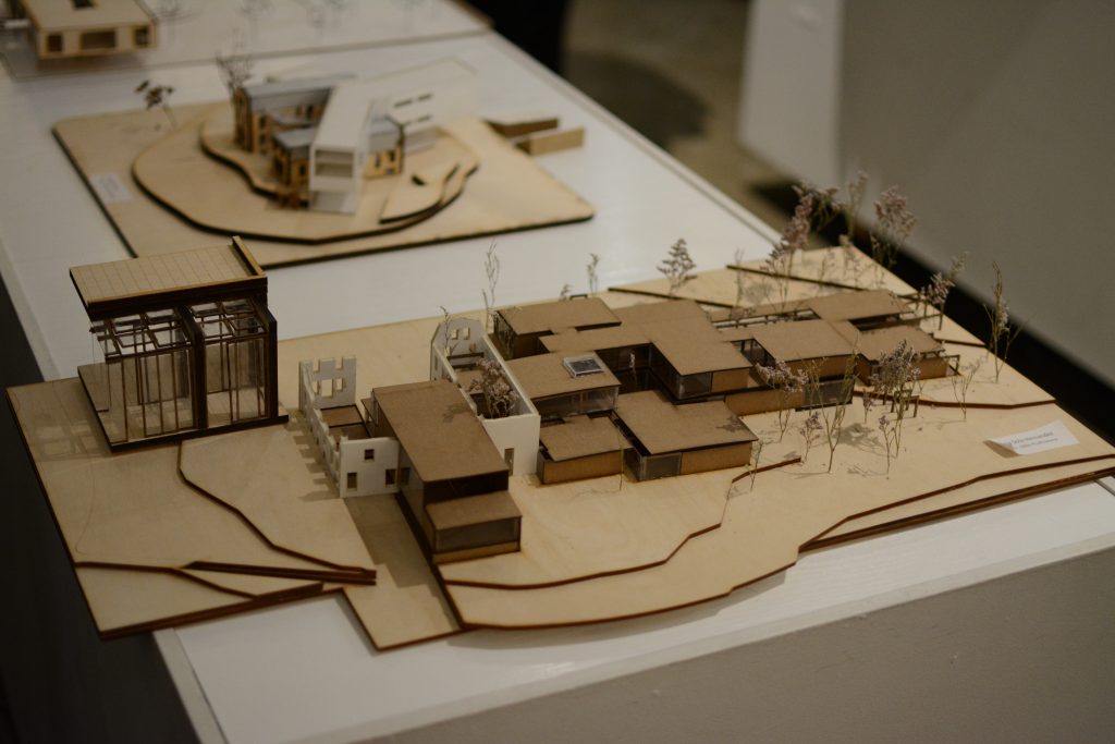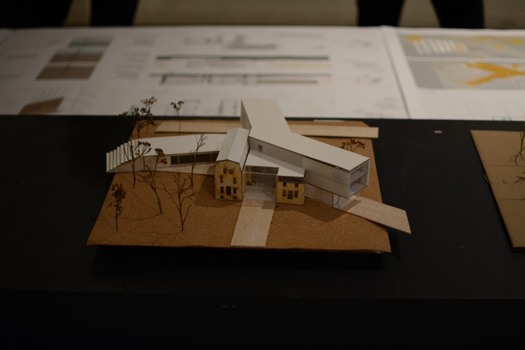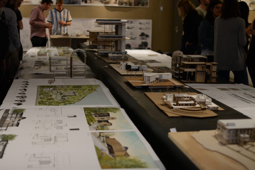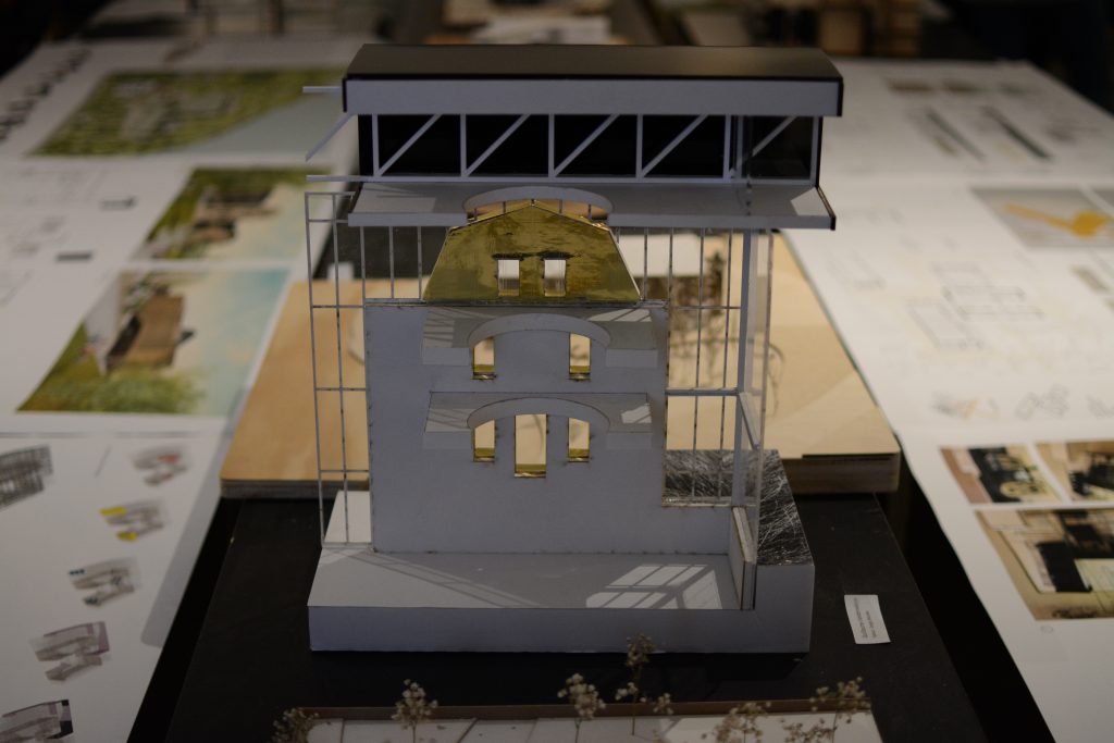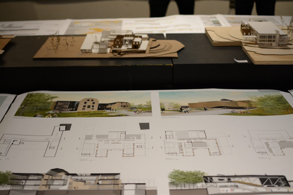 Environ 35 des 68 projets produits en classe sont exposés. Certains montrent des maquettes proposant des terrasses extérieures, d’autres un lieu intérieur très vivant en plein cœur d’un bâtiment surélevé. Sautant de maquettes d’établissement d’enseignement d’un style moderne à plus traditionnel, les étudiants ont proposé des plans qui respectent et mettent en valeur le monument patrimonial.