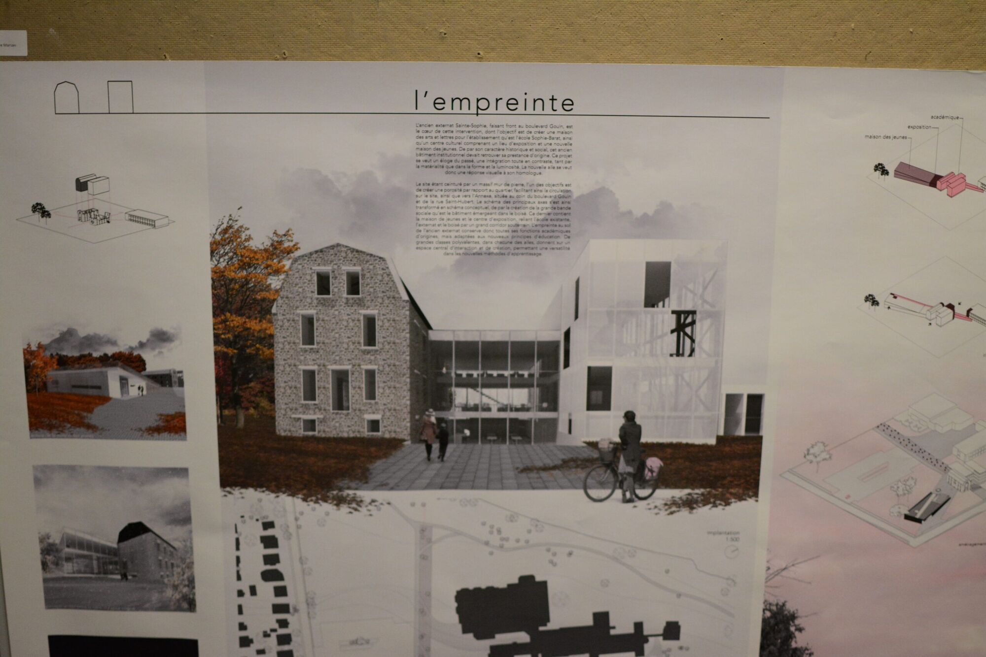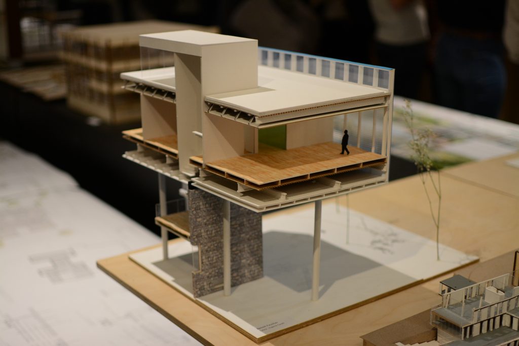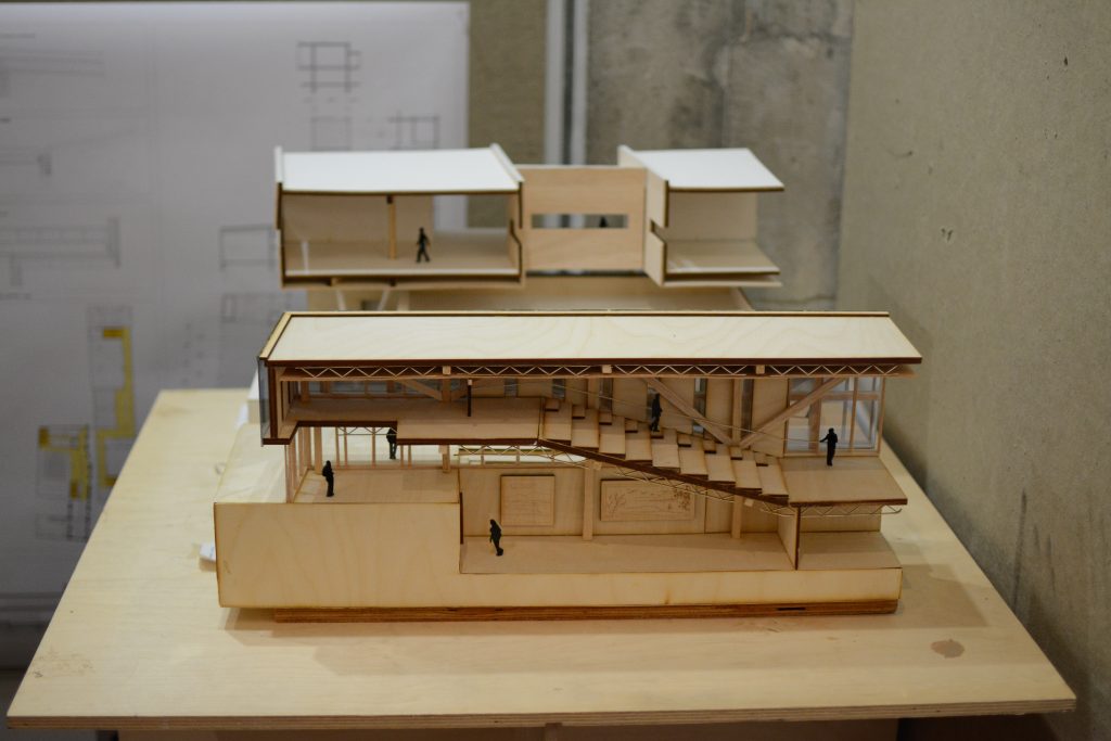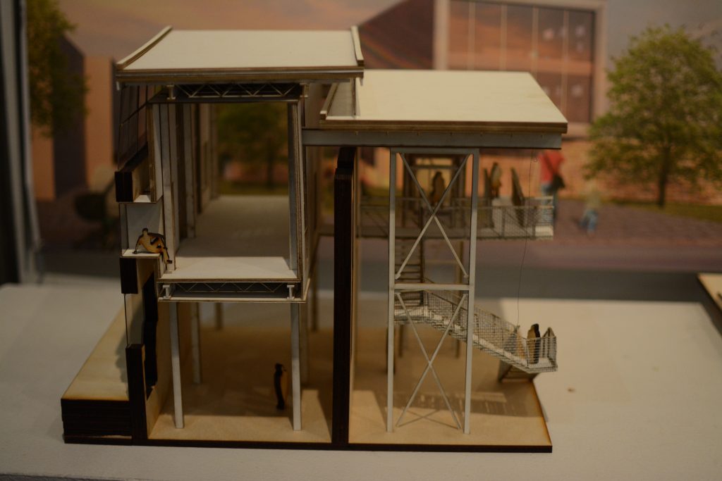 Environ 35 des 68 projets produits en classe sont exposés. Certains montrent des maquettes proposant des terrasses extérieures, d’autres un lieu intérieur très vivant en plein cœur d’un bâtiment surélevé. Sautant de maquettes d’établissement d’enseignement d’un style moderne à plus traditionnel, les étudiants ont proposé des plans qui respectent et mettent en valeur le monument patrimonial.