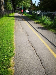 Ailleurs, la piste regorge de bosses, en fait de l’asphalte un peu surélevé ou fendillé. Ces ouvertures ne sont pas toutes perpendiculaires aux roues du vélo quand on se déplace. En plusieurs endroits d’ailleurs, un trait de peinture indélébile signale le danger potentiel. Ces indications ont pourtant été faites il y a plusieurs années.