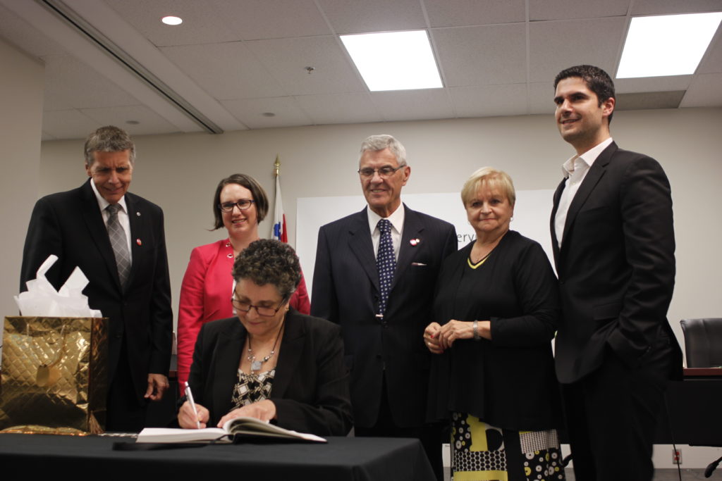 Maysoun Faouri, dg de Concertation Femme, signe le livre d’or de l’arrondissement à l’ouverture de la séance du conseil. À l’arrière, de g. à dr.: Pierre Desrochers, conseiller de St-Sulpice et président du comité exécutif; Emilie Thuillier, conseillère d’Ahuntsic; le maire Pierre Gagnier; Lorraine Pagé, conseillère du Sault-au-Récollet; et Harout Chitilian, conseiller de Bordeaux-Cartierville et vice-président du comité exécutif. (Photo: Évelyne Auger, JDV).