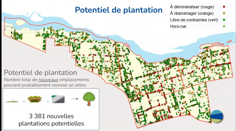 Pour remplacer les 9 910 arbres en fin de vie dans l’arrondissement, un total de 14 881 plantations est visé d’après le Plan maître de plantation, ce qui dépasse le simple calcul de 1 300 arbres fois 10 ans. Plus d’arbres seront plantés afin d’exploiter davantage le potentiel du territoire : 3 381 nouveaux sites, sur rue et hors rue, seront ciblés dans les 10 prochaines années.