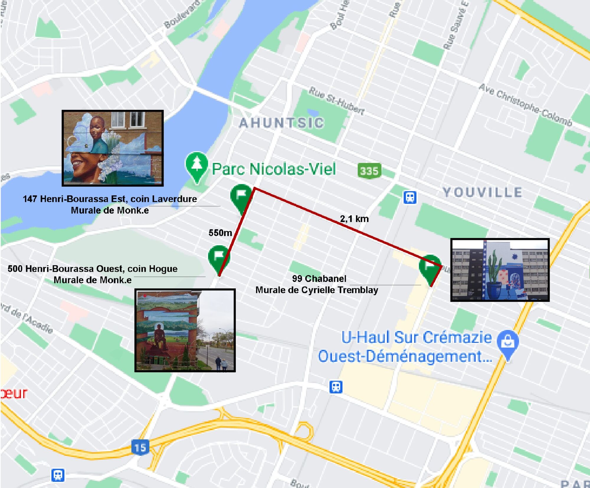 Localisation des trois nouvelles murales dans Ahuntsic-Cartierville (source : Google maps)