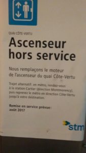 Signalons que le réseau du métro compte actuellement 12 stations de métro disposant d’ascenseurs. Ces stations sont toutes situées sur la ligne orange. Les stations Montmorency, de la Concorde, Cartier, Jean-Talon, Berri-UQAM, Champ-de-Mars, Lionel-Groulx, Henri-Bourassa, Côte-Vertu, Snowdon, Rosemont et Place-d’Armes sont accessibles au niveau de la rue pour les personnes en fauteuil roulant. La station Bonaventure est partiellement accessible, entre le niveau billetterie et les quais seulement. Il n’y a pas d’accès pour le niveau rue pour l’instant.