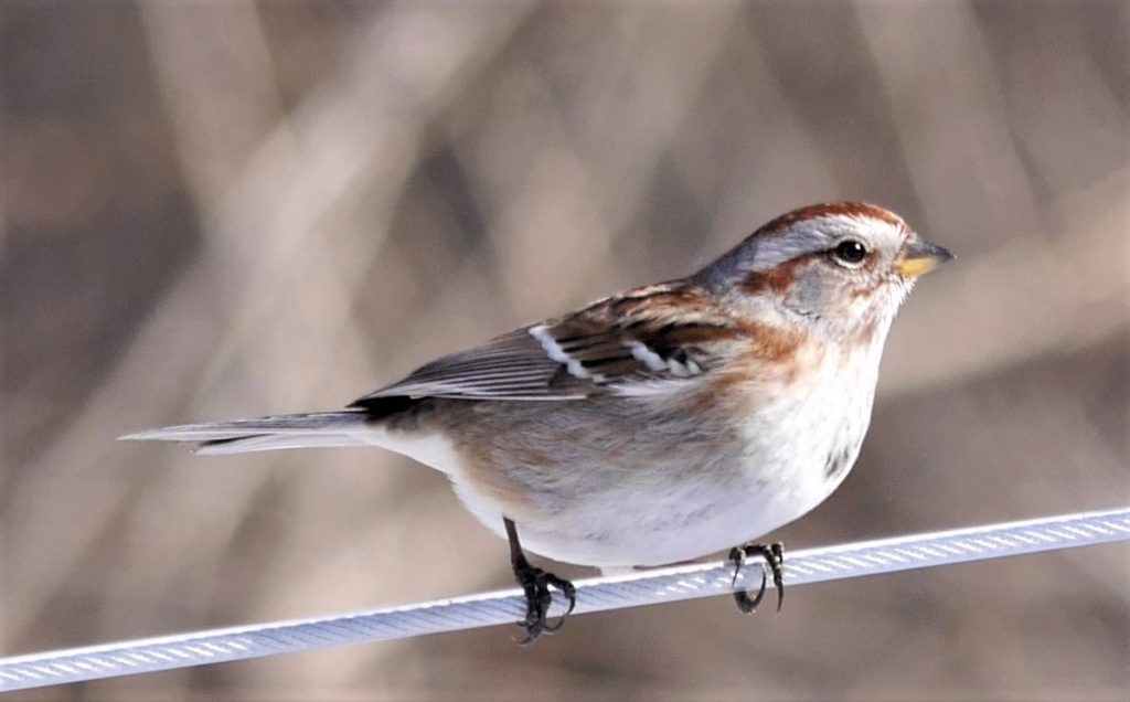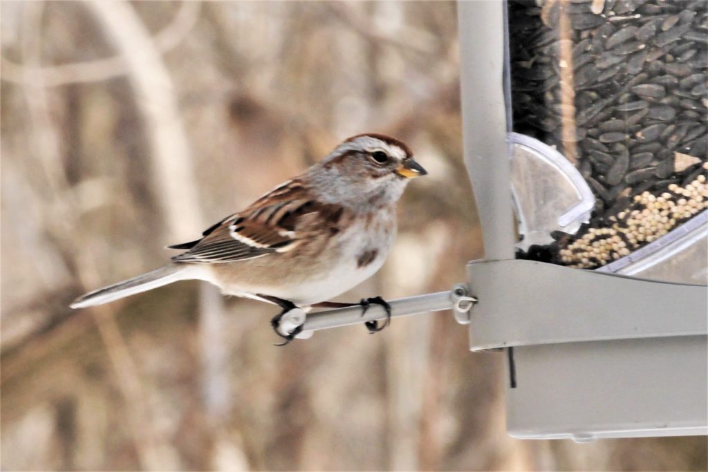 Je vous avais déjà mentionné qu’en hiver on peut s’attendre à des visiteurs ailés venus du Nord. Le Bruant hudsonien est l’un de ceux que l’on peut apercevoir à nos latitudes en saison froide seulement. Car, comme son nom l’indique, il niche dans la portion nordique du Canada, notamment autour de la Baie d’Hudson, et en Alaska.