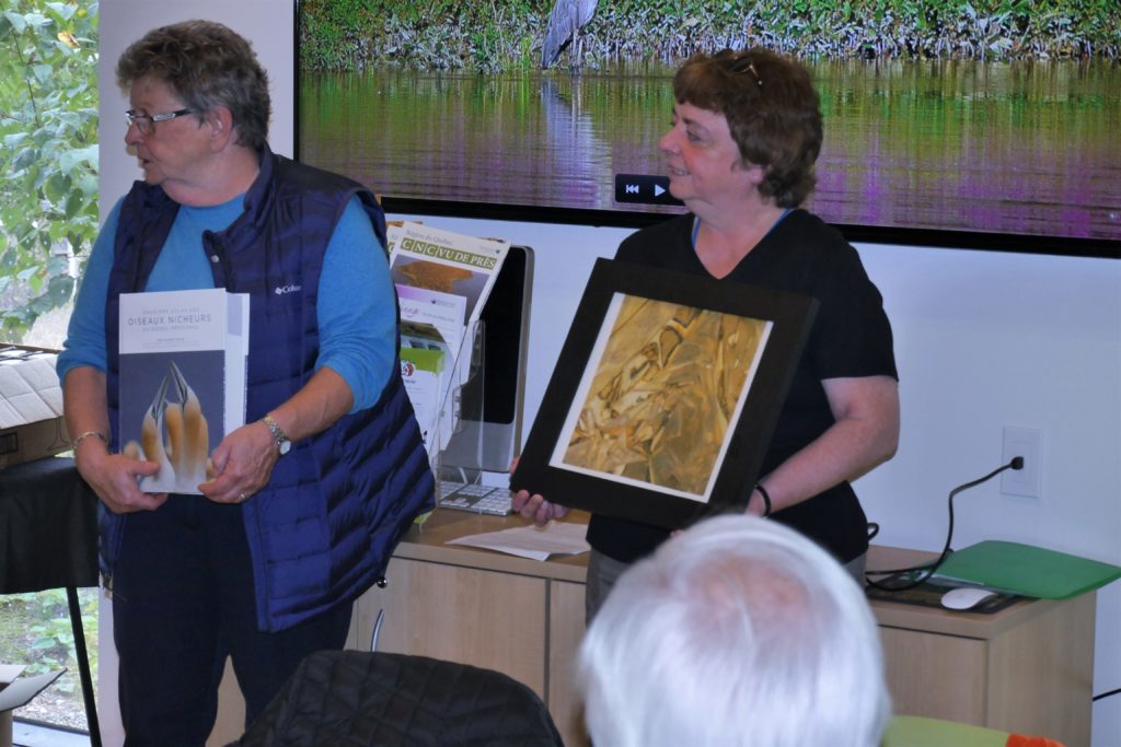 Mme Lafortune reçut une aquarelle et un exemplaire du deuxième Atlas des Oiseaux nicheurs du Québec méridional en guise de reconnaissance pour son engagement remarquable au sein du COA depuis près de 25 ans.
