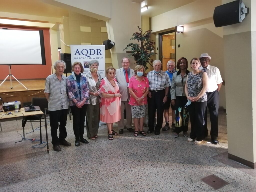 L’Association québécoise de défense des droits des personnes retraitées et préretraitées (AQDR) Ahuntsic-Saint-Laurent a tenu son assemblée générale annuelle le jeudi 13 août 2020. Les thèmes les plus importants de l’AGA portés sur la retraite citoyenne et la défense des droits des aînés. Nous retrouvons ci-dessous la photo de la nouvelle équipe de l’association, formé de gauche à droite des personnes suivantes : Gilles Léveillé, administrateur; Hélène Robillard-Frayne, administratrice; Jeannine Roy-Nuckle, administratrice; Amy Nalbandian, secrétaire; François Marquis, président; Zaida Nunez, administratrice; Osvaldo Nunez, vice-président; Jean Paul Lahaie, trésorier; Nadia Kapinga, coordonnatrice; Malika Boucherrab, secrétaire-comptable; Samuel Luboya, administrateur. (Source: AQDR)