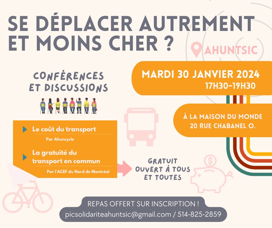 Rendez-vous le mardi 30 janvier à partir de 17h30 à la Maison du Monde, dans Saint-Simon, pour deux conférences autour du coût du transport!