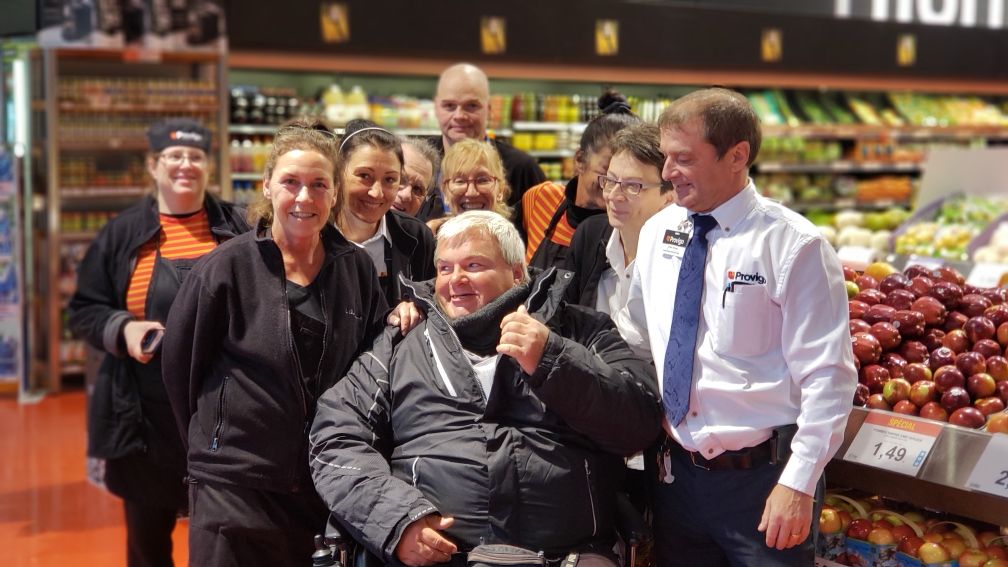 À l’approche de la saison froide, le Provigo Michel-Ricard avec la complicité de ses employés ont remis à leur ami Mario, qui donne un coup de main parfois à l’épicerie, un manteau d’hiver bien chaud. (Photo : Courtoisie)