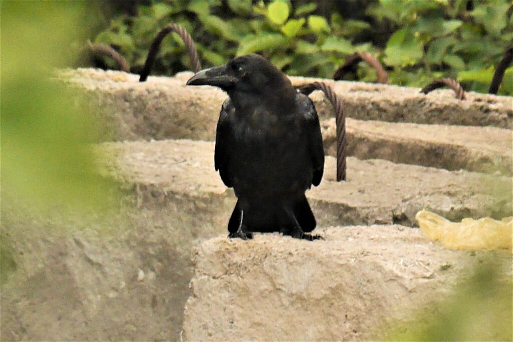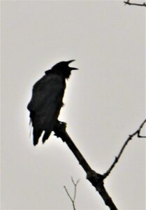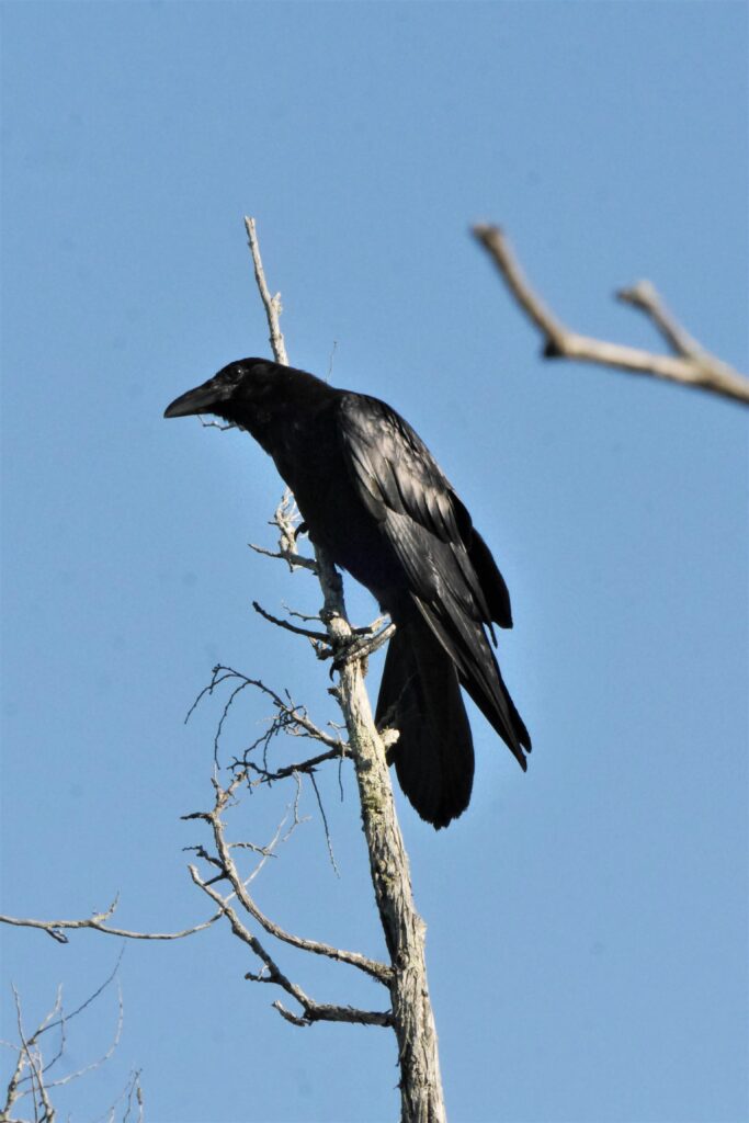 J’ai souvent vu un Corbeau sur un arbre perché mais aucun qui tenait dans son bec un fromage. Voilà pour la fable. Maintenant, essayons de distinguer le Grand Corbeau de la Corneille d’Amérique plus commune chez nous.