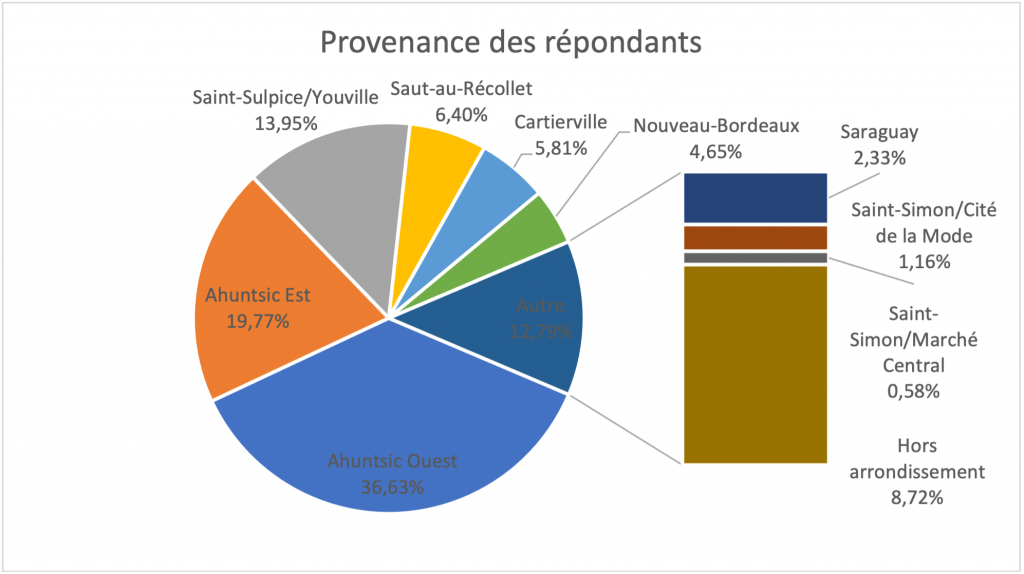 Ainsi, une infime minorité s’identifie comme une minorité visible (3,5 %) ou ethnique (3 %) et aucun répondant ne dit appartenir aux Peuples autochtones du Canada (Premières Nations, Inuit ou métis). À titre de comparaison, 38 % de la population de l’arrondissement s’identifie à une minorité visible et 0,4 % se déclare d’identité autochtone, selon le plus récent profil démographique d’Ahuntsic-Cartierville.