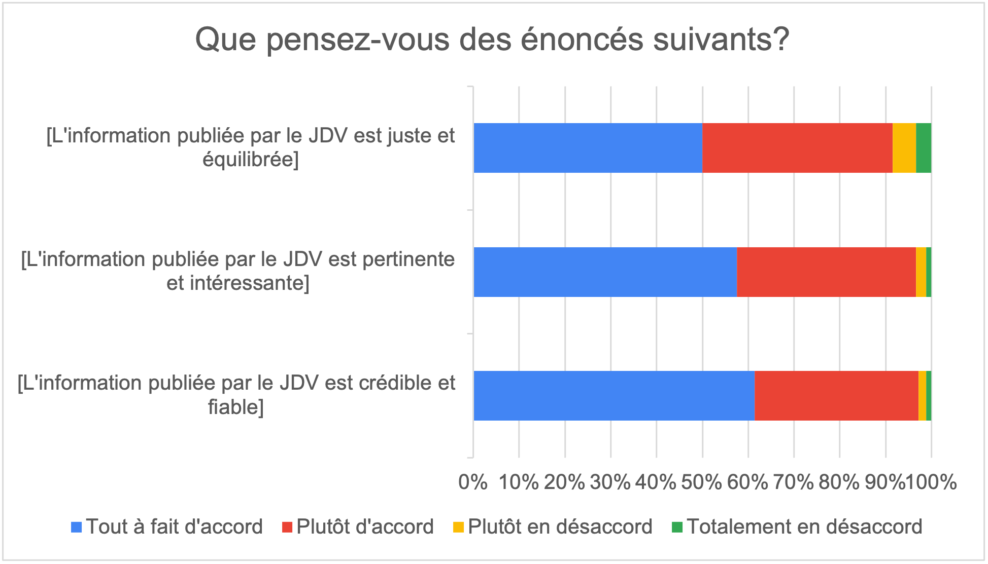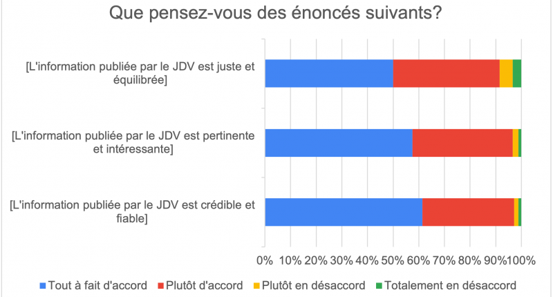 De l’avis des personnes qui ont répondu à notre sondage, l’information publiée par le JDV est à la fois crédible et fiable (61 % tout à fait d’accord, 36 % plutôt d’accord), pertinente et intéressante (57 % tout à fait d’accord, 39 % plutôt d’accord) ainsi que juste et équilibrée (49 % tout à fait d’accord, 41 % plutôt d’accord).
