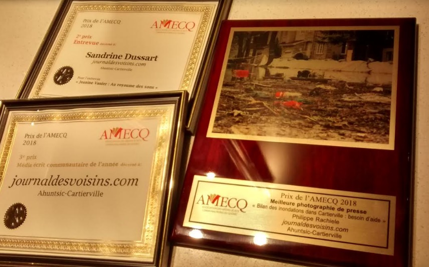 Journaldesvoisins.com a remporté trois prix au gala annuel 2018 des Prix de l’Association des médias écrits communautaires du Québec (AMECQ) qui avait lieu à Sainte-Adèle, dans les Laurentides, samedi soir, 28 avril.