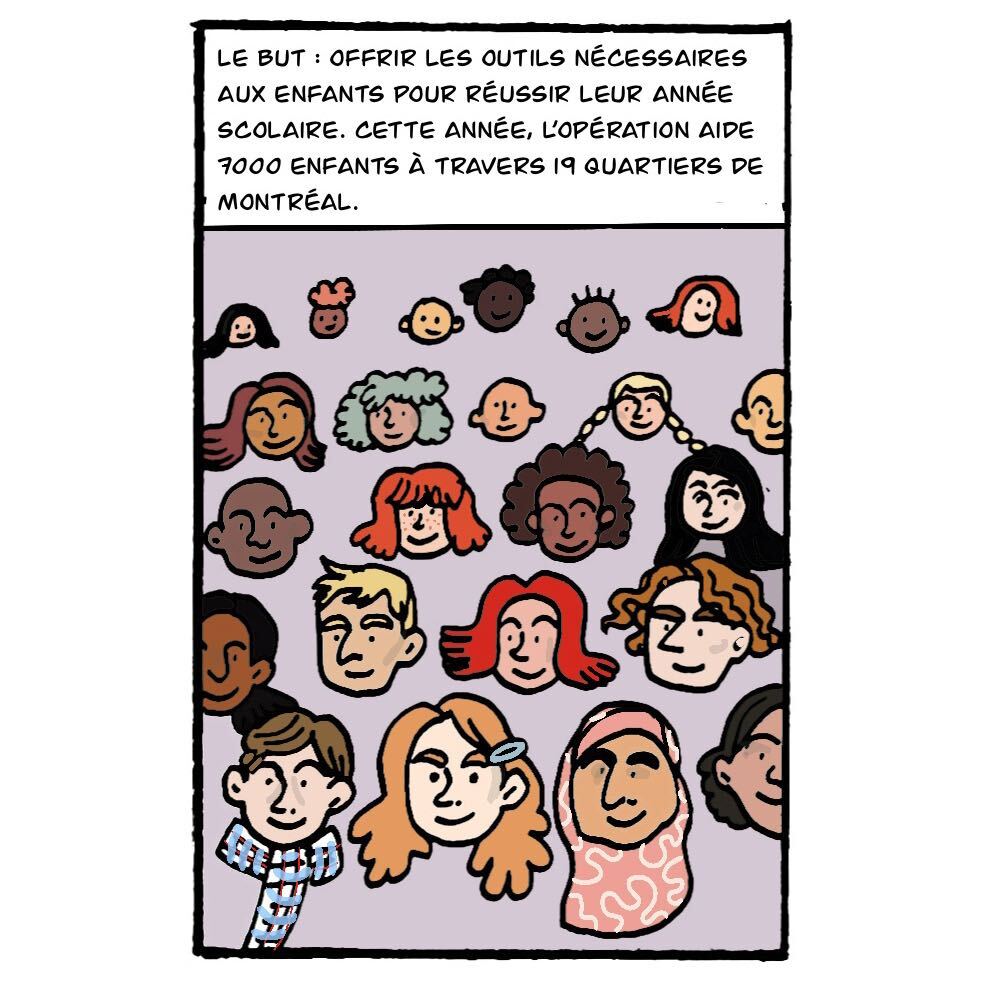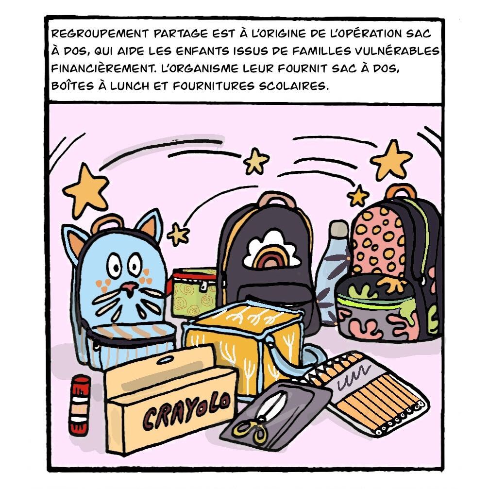 Née sur l’initiative de l’organisme Regroupement Partage, l’Opération sac à dos a pour but de venir en aide aux enfants issus de familles économiquement fragiles.