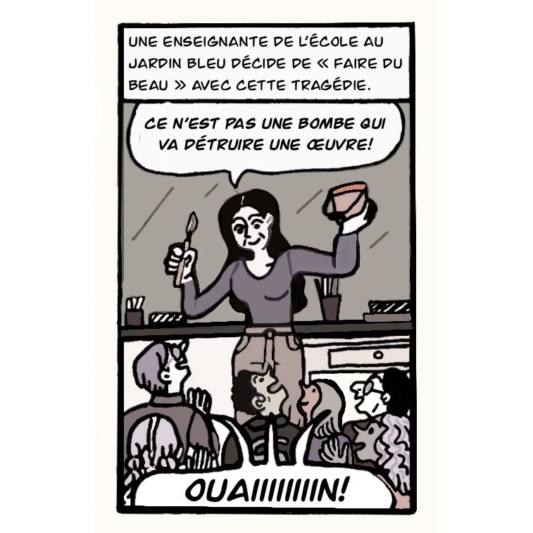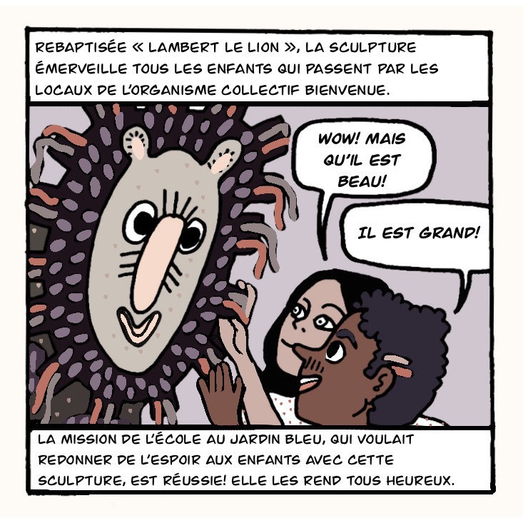 Le Journal des voisins vous présente cette BD dédiée au jeune public. Celle-ci illustre l’histoire d’une sculpture réalisée par des enfants de l’école au Jardin bleu à Ahuntsic-Cartierville. Le Journal des petits voisins vise à informer nos jeunes lecteurs de façon ludique grâce au dessin. (Illustration: Camille Vanderschelden, JDV)