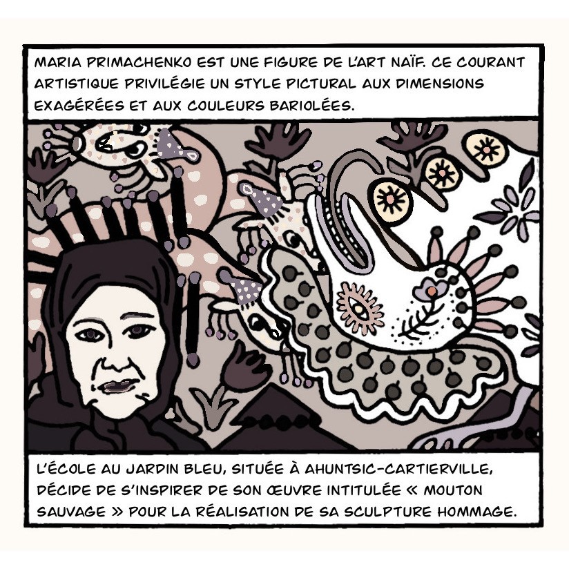 Les enfants, tout comme les plus grands, peuvent ainsi en apprendre plus sur leur quartier de façon ludique. Aujourd’hui, le JDV vous fait découvrir le destin d’une sculpture monumentale réalisée par l’école au Jardin bleu. Née sur l’initiative d’une enseignante, l’œuvre collective rend hommage a une grande artiste ukrainienne: Maria Primachenko.