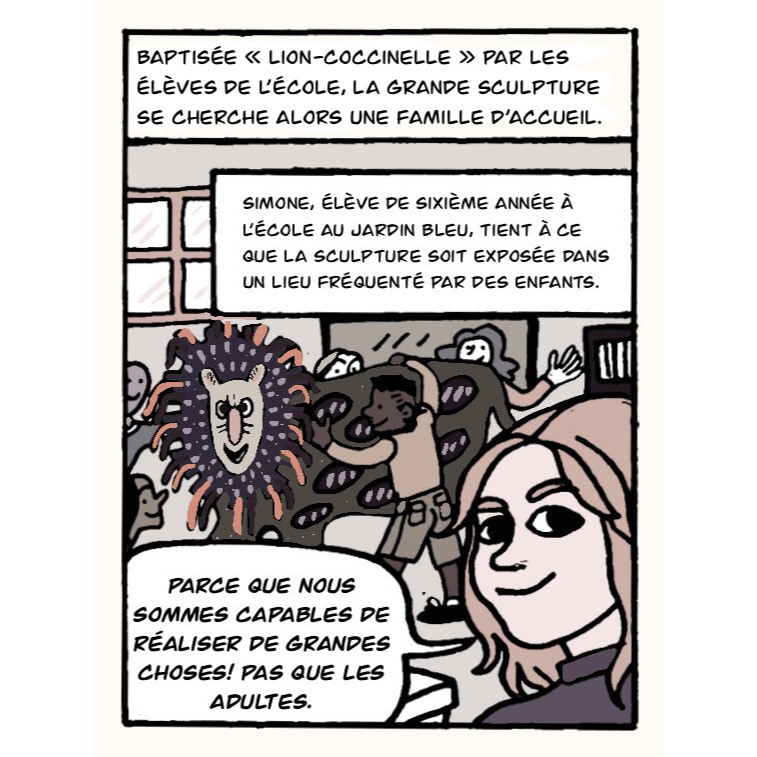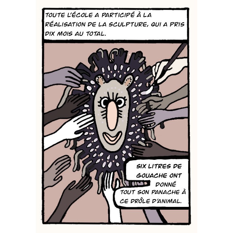 Dans cette bande dessinée, le Journal des petits voisins vous invite à la découverte d’une sculpture d’un animal géant réalisée par des écoliers.
