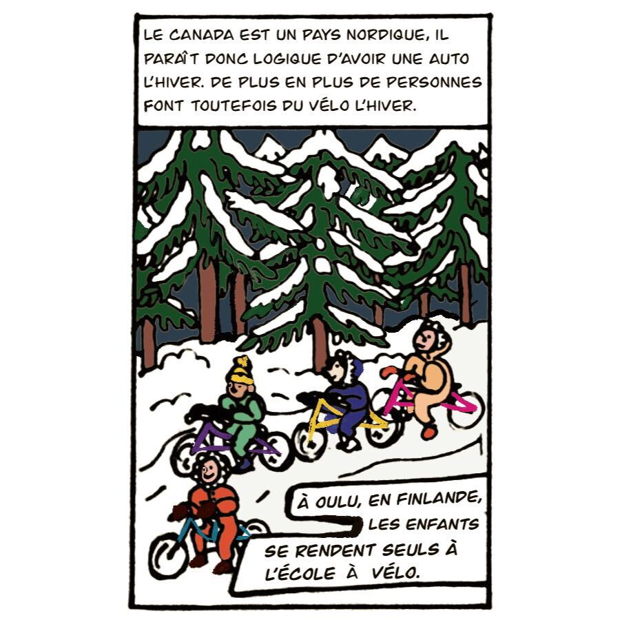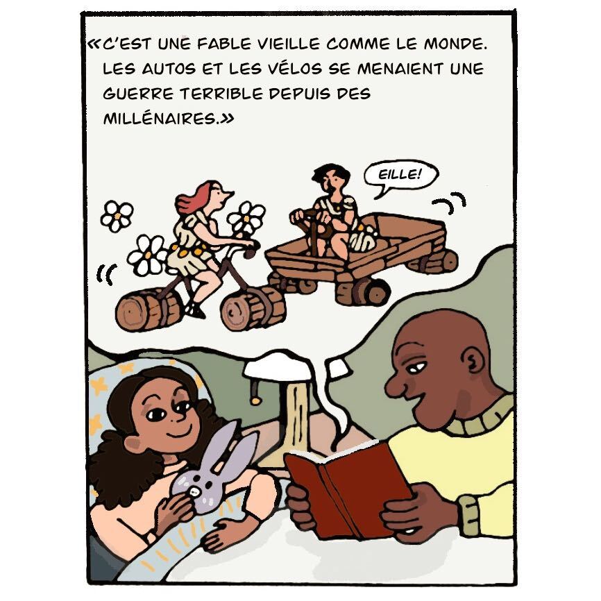 Notre illustratrice présente aux petits voisins une bande dessinée évoquant le conflit entre les amateurs de vélos et les automobilistes. (Illustration: Camille Vanderschelden, JDV)