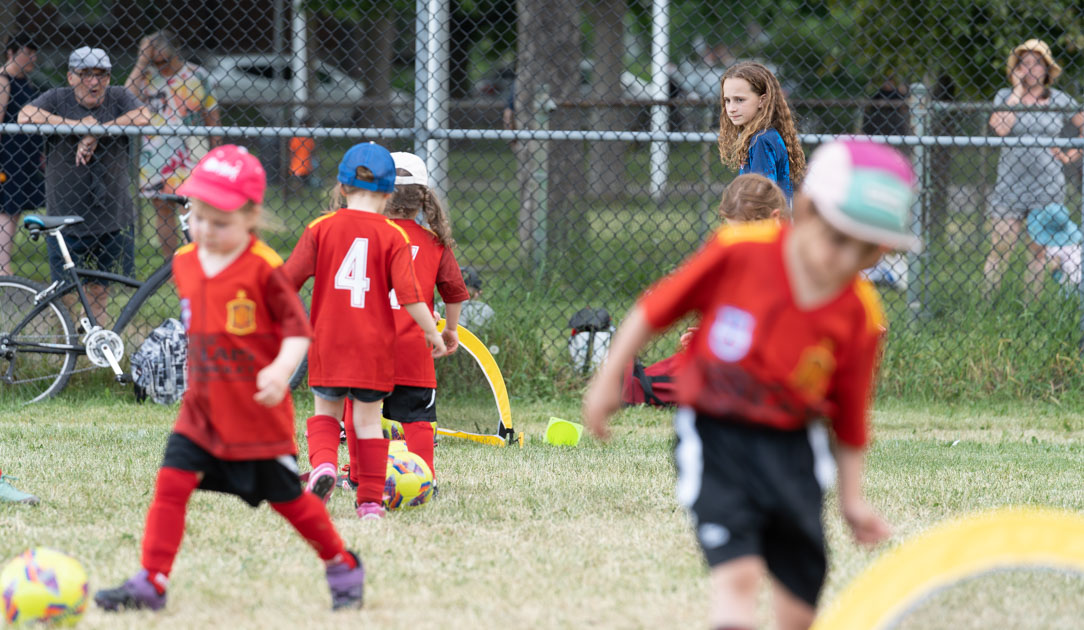 Cultiver l’envie de jouer au soccer pour les jeunes filles est un défi, surtout à l’adolescence. Or, de nombreuses initiatives sont créées afin de favoriser la rétention des joueuses comme Emma (chandail bleu à droite), 12 ans, qui joue au soccer pour les Braves depuis l’âge de six ans. En plus de jouer, elle supervise de jeunes joueuses. Comme quoi, la roue tourne!