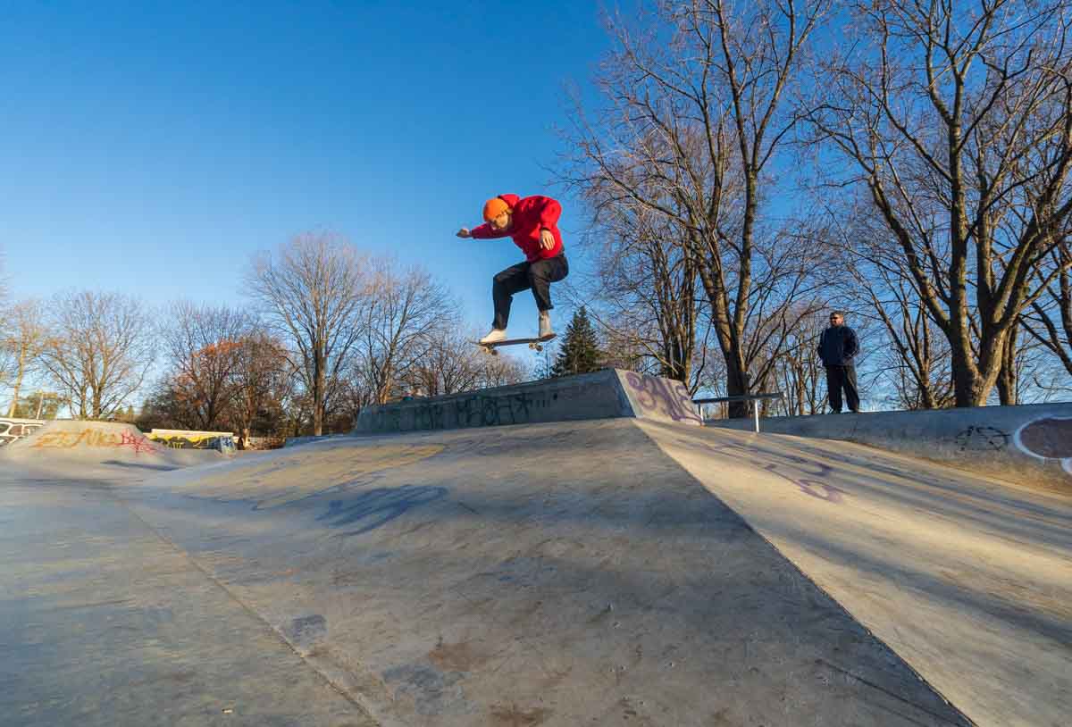 Pratiquer la planche à roulettes, c’est une série de transferts de poids qui t’amène… à voler. On en a eu la démonstration lors de l’inauguration du planchodrome du parc Ahuntsic.
