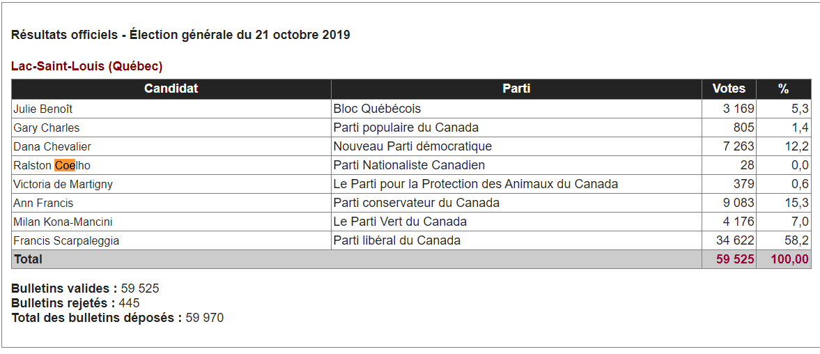 Il suffit en effet de quelques recherches sur Internet pour découvrir qu’il y a quatre ans seulement, Ralston Coelho était le candidat du Parti nationaliste canadien (PNC) pour la circonscription montréalaise de Lac-Saint-Louis, lors des élections fédérales de 2019.