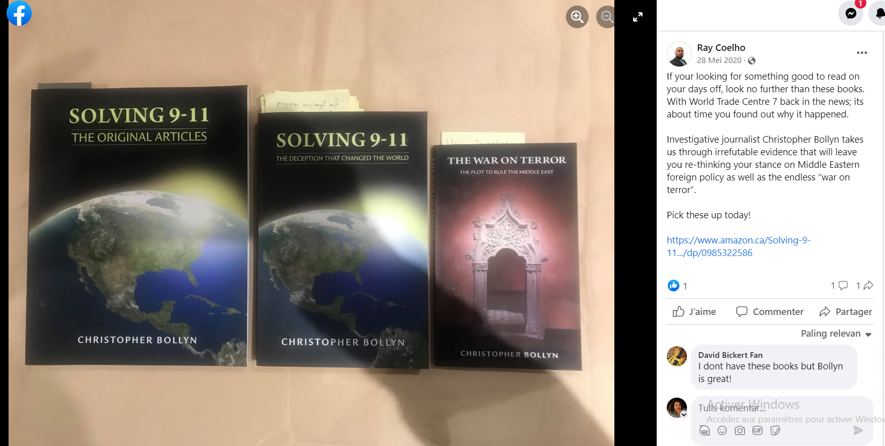 On note sur son fil Facebook la publication en mai 2020 d’une photo de livres. Ray Coelho partage en effet ses lectures: Solving 9-11, en deux tomes, et The war on terror par Christopher Bollyn.