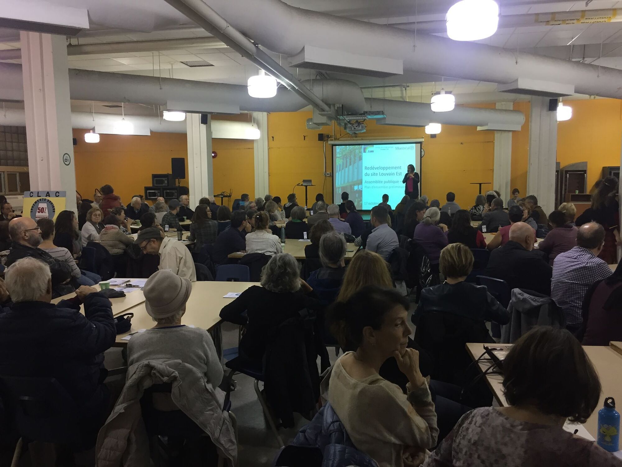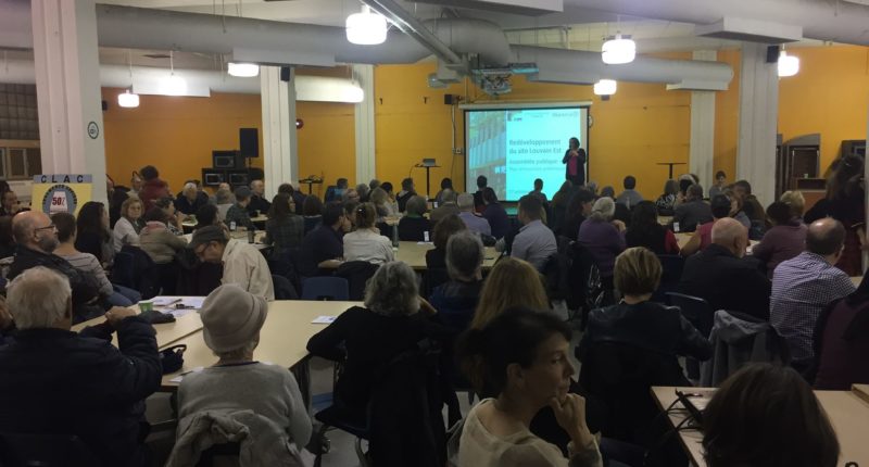 Malgré la météo peu clémente, la pluie n’ayant toujours pas cessé de s’abattre sur l’arrondissement depuis la veille au soir, l’assemblée publique sur le développement du site Louvain Est du 17 octobre a attiré un très grand nombre de citoyens. La salle qui les accueillait, située dans la cafétéria du Collège Ahuntsic, était pleine à craquer. Un nombre beaucoup plus important de citoyens se sont déplacés en comparaison avec la dernière assemblée publique sur le projet, tenue le 19 juin dernier, en présence d’un nombre appréciable de citoyens.
