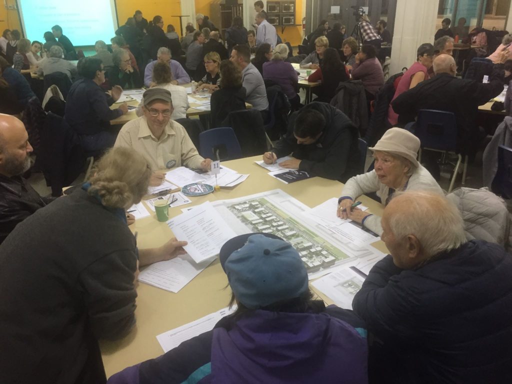 Jacques Ménard était le modérateur de cette soirée ayant pour but de donner la parole en priorité aux citoyens. Les personnes présentes étaient donc regroupées par tables pour maximiser les discussions de manière à ce que tous puissent s’exprimer et donner leur opinion. Quarante-cinq minutes de discussions sur un plan du futur site étaient accordées aux citoyens, suivies d’une synthèse des principales idées retenues à chaque table, présentée par un des membres de chaque groupe.