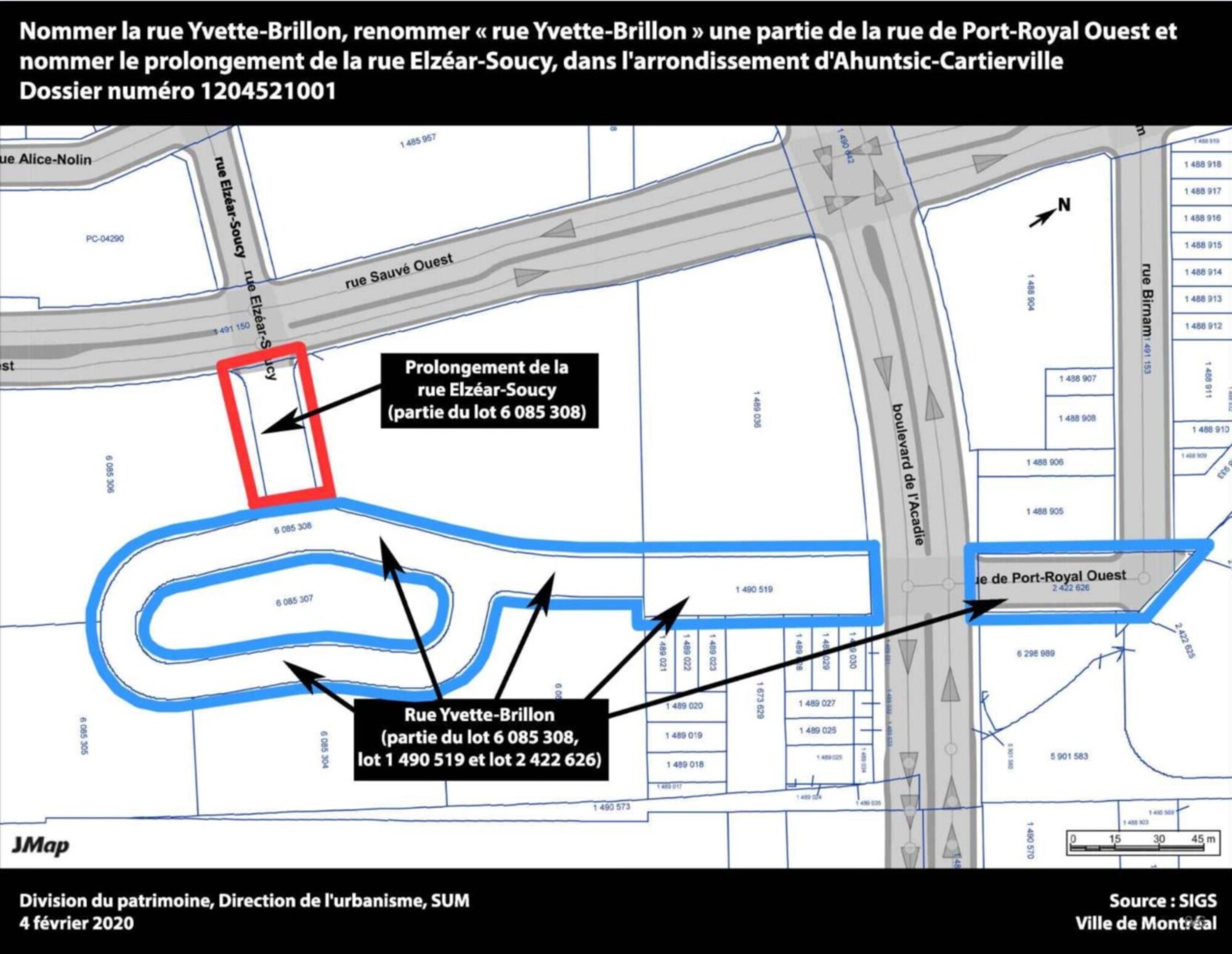 D’autre part, on a aussi procédé à un changement de nom de rue. La rue pour sortir du projet Voltige et qui passe par le terrain du magasin de location d’outils Simplex pour aller sur le boulevard l’Acadie et vers le Home-Dépôt derrière s’appelle présentement Port-Royal. La rue Port-Royal se trouve à plusieurs endroits dans l’arrondissement. Mais à cet endroit, le tronçon est tout petit, il fait seulement un coin de rue. C’est ce petit tronçon de rue qui va devenir « Yvette-Brillon ».