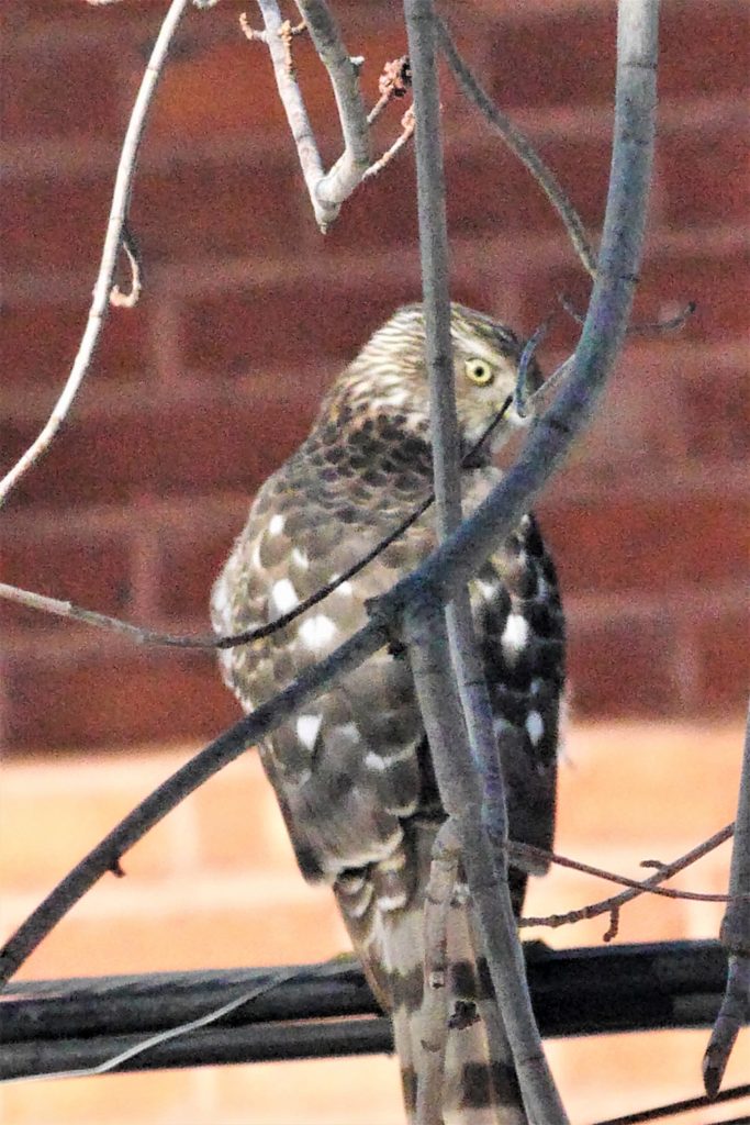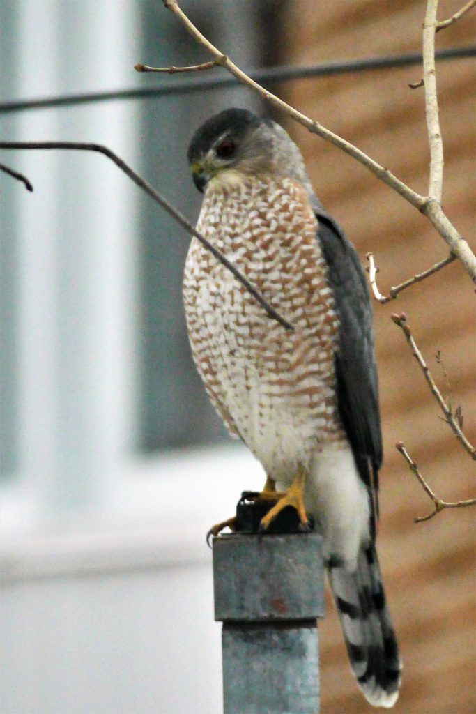 Les moineaux de ma cour avaient raison de fuir précipitamment. L’Épervier de Cooper se nourrit principalement de petits oiseaux, bien qu’il ne dédaigne pas un volatile de plus grande taille comme le pigeon.
