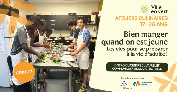 Ville en vert organise une série de six ateliers de cuisine pour les 17 à 25 ans. Ceux-ci permettront aux jeunes d’en apprendre davantage sur la préparation de repas et sur l’importance d’une alimentation saine. Ils pourront également développer leur autonomie en cuisine.