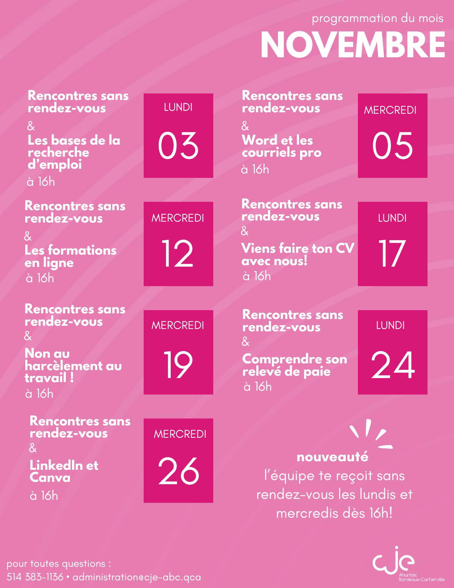 Novembre chez le Carrefour jeunesse-emploi Ahuntsic Bordeaux-Cartierville (CJE ABC)