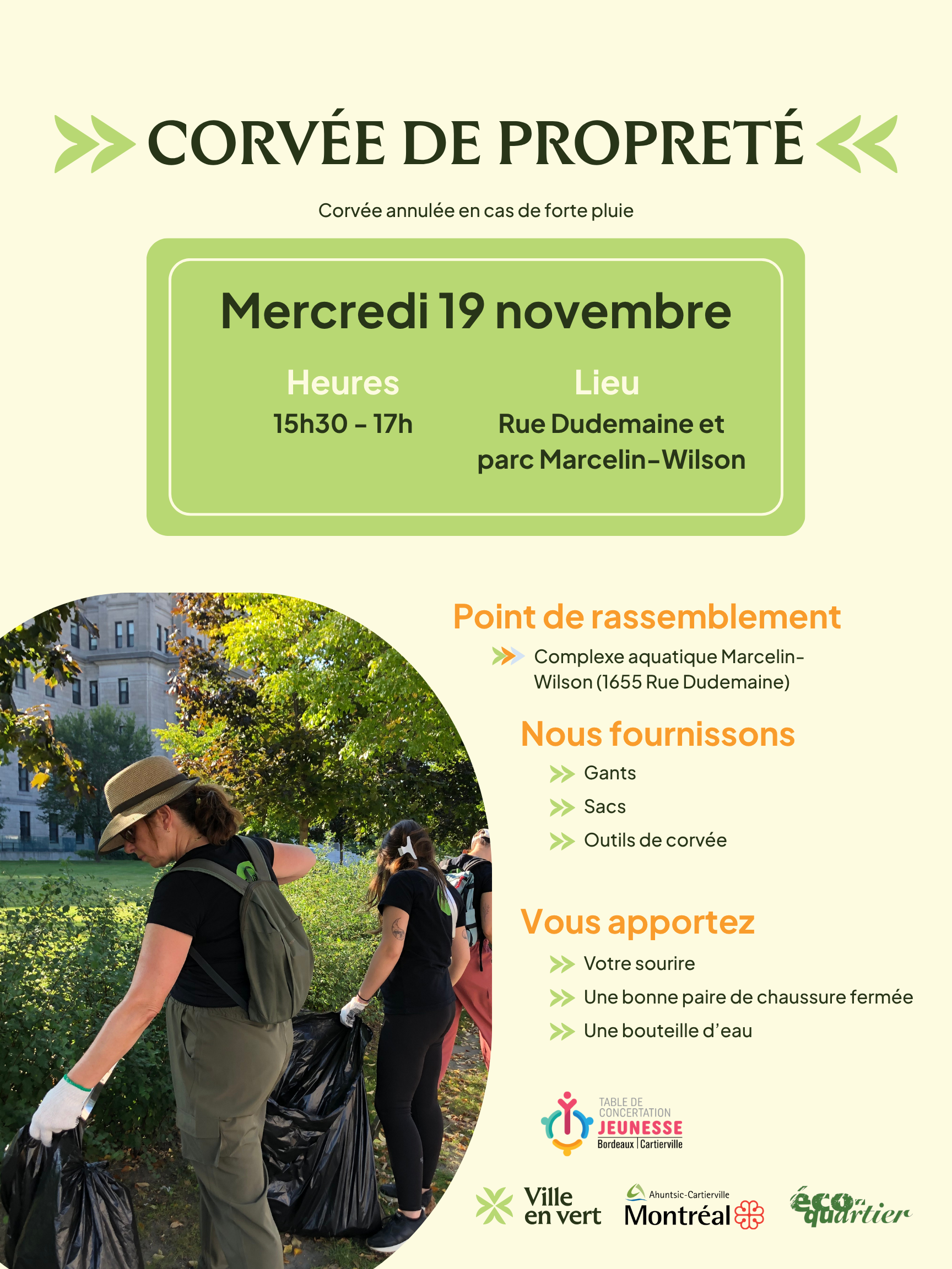 La Table de concertation jeunesse Bordeaux-Cartierville, en collaboration avec Ville en vert, préparent une session de nettoyage de la rue Dudemaine et de ses environs. Celle-ci aura lieu le 19 novembre à 15 h 30.