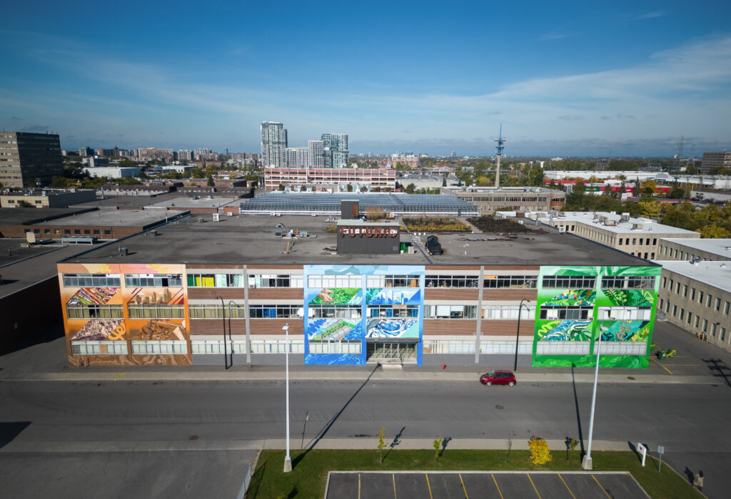 La murale Cocréer notre futur célèbre l’économie circulaire et l’agriculture urbaine qui sont au cœur du développement économique socioéconomique du territoire District Central situé dans Ahuntsic-Cartierville.