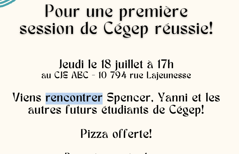 Un séance d’information sur le projet Transition vers le Cégep sera organisée le 18 juillet à 17 h au CJE ABC, situé au 10 794 rue Lajeunesse. Celui-ci vise à accompagner les finissants de secondaire 5 et à assurer leur réussite en leur offrant des outils et informations cruciales.