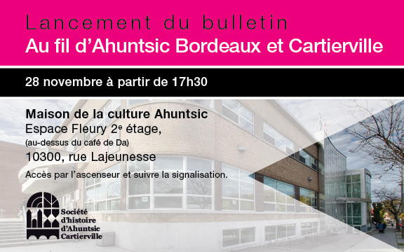 Jeudi 28 novembre, la Société d’histoire d’Ahuntsic-Cartierville (SHAC) lancera son nouveau bulletin et inaugurera son local au cours d’un cocktail. L’événement commencera à 17 h 30 et accueillera différents membres de la SHAC qui retraceront l’histoire du bulletin et présenteront leurs textes.