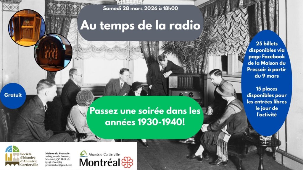 La Société d’histoire d’Ahuntsic-Cartierville (SHAC) organisera l’activité « Au temps de la radio », le samedi 28 mars à 18 h, à la Maison du Pressoir.