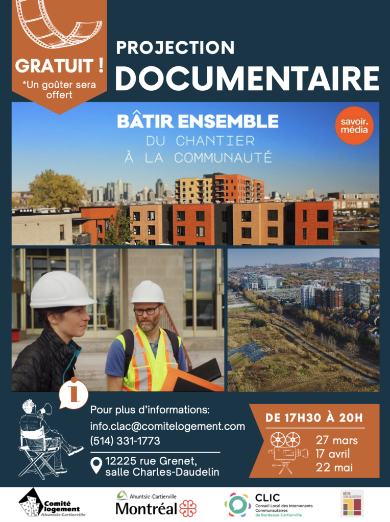 Les six épisodes de la série documentaire « Bâtir ensemble, du chantier à la communauté » seront présentés en projection publique le 27 mars, le 2 avril et le 22 mai au Centre culturel et communautaire de Cartierville, de 17 h 30 à 20 h 30.