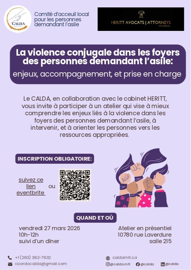 Organisée par le Comité d’accueil local pour les personnes demandant l’asile (CALDA) en collaboration avec le cabinet HERITT, elle se déroulera au Centre communautaire d’Ahuntsic, situé au 10780 rue Laverdure.