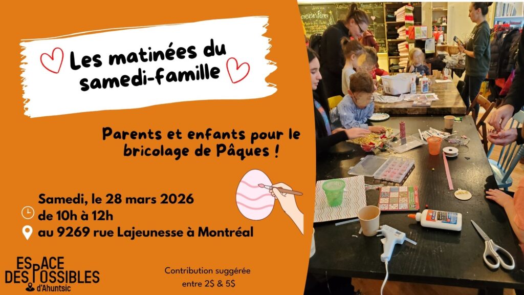 Espace des Possibles organisera une session animée de bricolage pour Pâques le samedi 28 mars 2026, de 10 h à 12 h, au 9269 rue Lajeunesse.