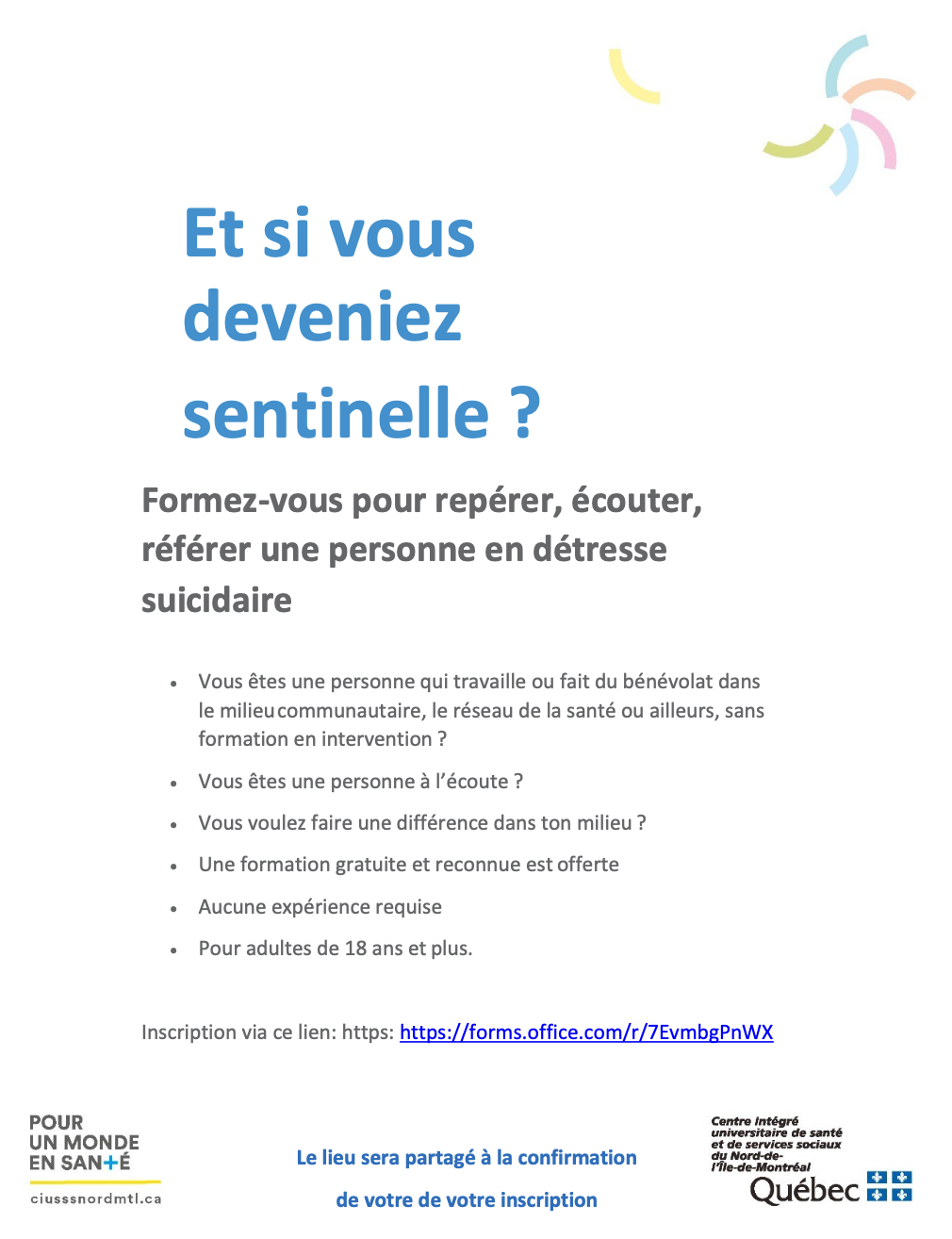 Le CIUSSS du Nord-de-l’Île-de-Montréal propose un programme de prévention du suicide intitulé la formation Sentinelle.