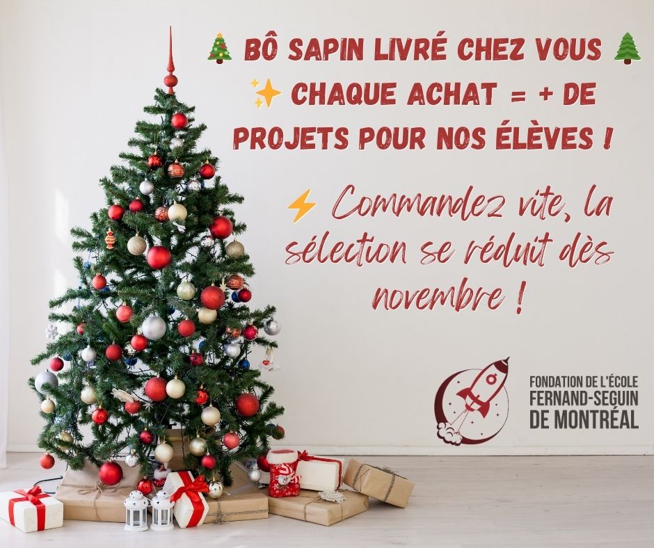 Vous pouvez commander votre sapin de Noël et le recevoir directement à votre porte. Lors de votre achat, une partie des profits sera remise à la Fondation de l’école Fernand-Seguin. Cela permettra de financer des activités éducatives, culturelles et sportives de l’école.