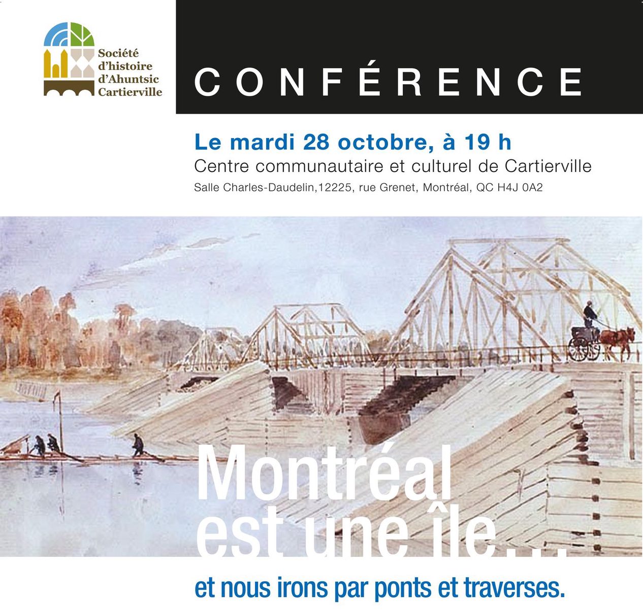 Le 28 octobre la Société d’histoire d’Ahuntsic-Cartierville présente la conférence Montréal est une île… et nous irons par ponts et traverses. Pierre Wilson, artisan menuiser et réalisateur de l’exposition Montréal, par ponts et traverses au musée de Pointe-à-Callière, animera la soirée.
