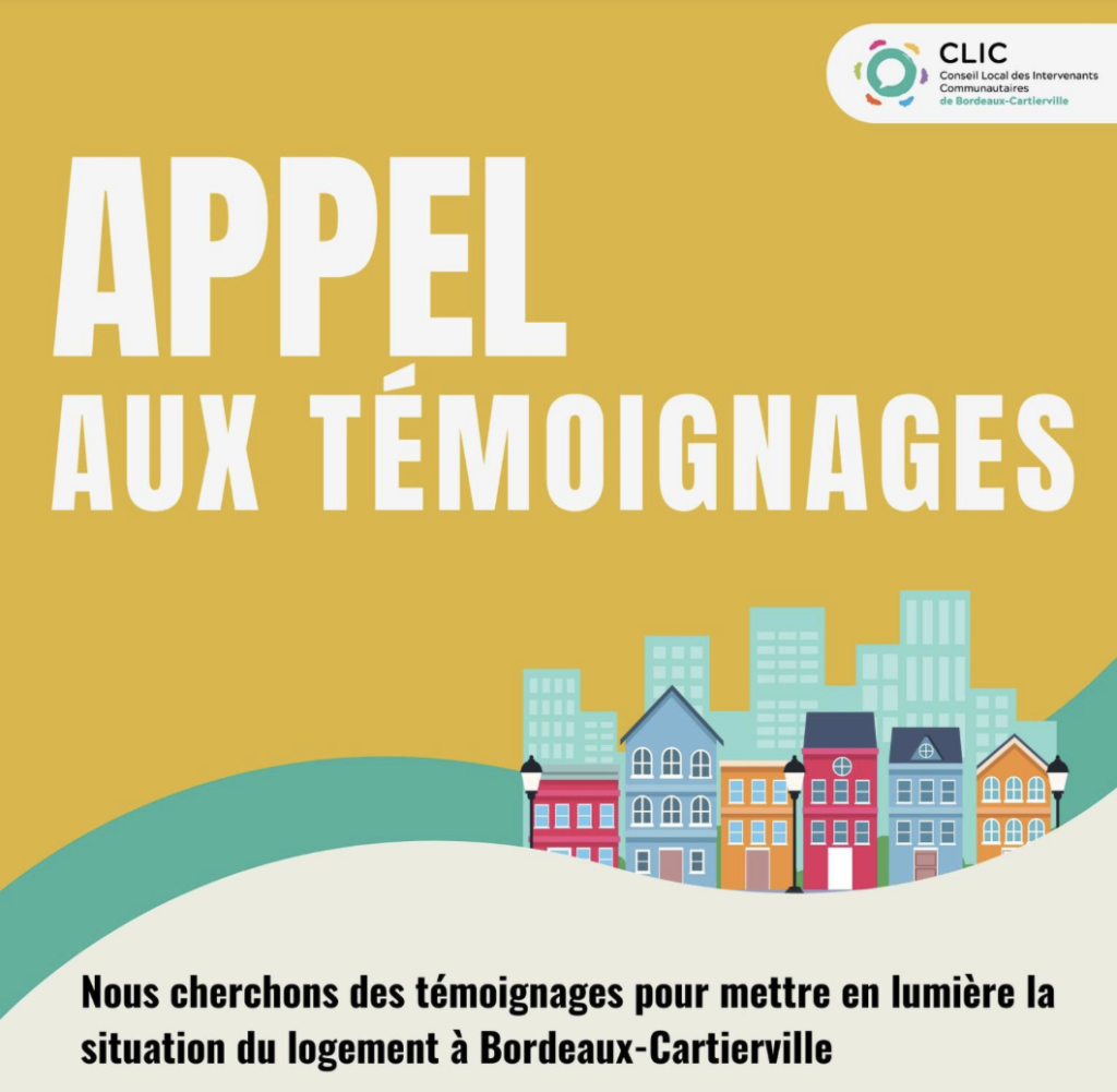 Le comité habitation Bordeaux-Cartierville organise un forum sur le logement le 17 avril, de 16 h à 19 h 30. À cette occasion, ses membres lancent un appel aux témoignages aux personnes résidant à Bordeaux-Cartierville ou y ayant habité durant les trois dernières années à propos de leur situation de logement.
